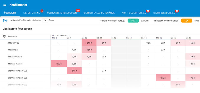 Finden statt Suchen: Das Konfliktradar macht Unsichtbares sichtbar. Ressourcenengpässe, verpasste Liefertermine oder fehlende Rückmeldungen – alle Abweichungen erscheinen auf einen Blick.
