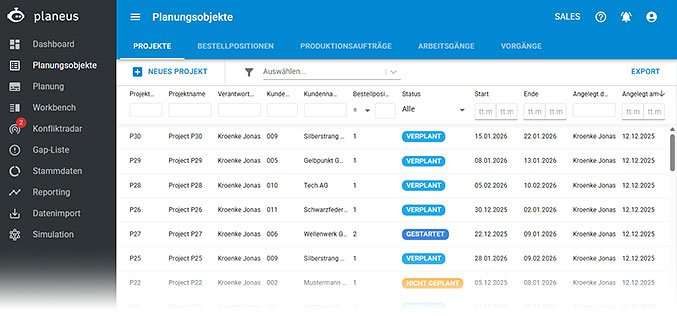 Planungsobjekte bilden die Grundlage für die Planung in planeus. Hier legen Sie Aufträge (Bestellpositionen) an und starten den Planungsalgorithmus.
