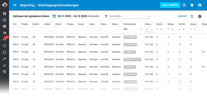 Das Reporting Basic ermöglicht die tabellarische Anzeige von allen Rückmeldungen der Arbeitsgänge und Vorgänge.